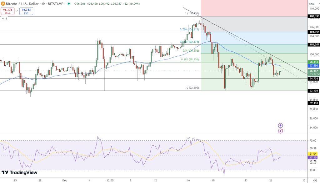 Bitcoin trades at $96,346, facing downward pressure. A key resistance lies at $98,300, with immediate support at $94,735 and potential downside to $92,105 if bearish momentum persists.
