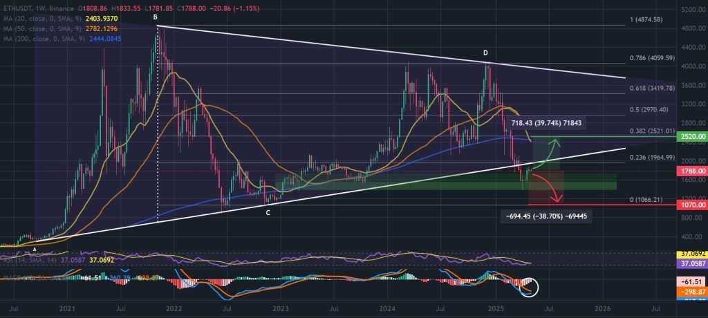 Should buying pressure return and the Ethereum price break back into the triangle pattern, the next major target sits at $2,520—a 40% move from current levels.